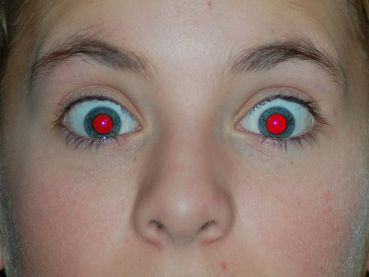 The human eye (and for that matter the eyes of other animals – cat and dogs get the red-eye effect too!) is essentially a clear lens that light passes through to be absorbed by the retina and turned into images. The retina is part of the fundus, the layer at the back of the eye, which is nourished by – you guessed it – blood vessels. Normally, when the eye is exposed to bright light the pupil contracts, so not very much of the light hits the fundus, but flash photography happens too fast for your eye to react, so most of the light gets through and lights up the pool of blood at the back of your eye.